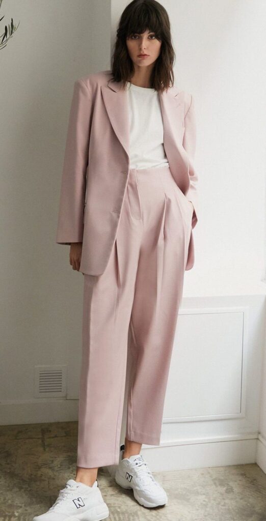 - Casual Sophistication: A grey sweater with blush pink trousers or a pleated skirt.